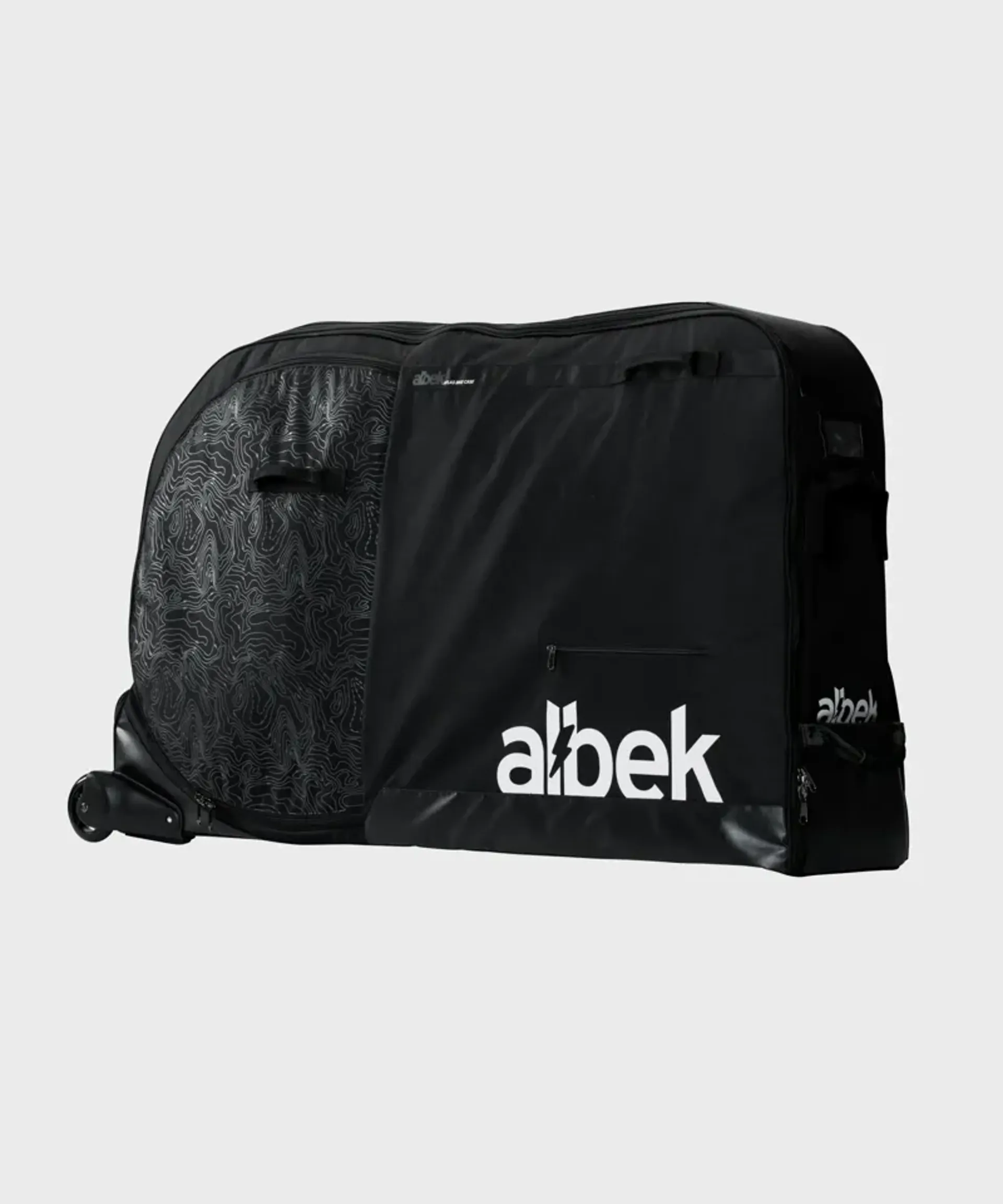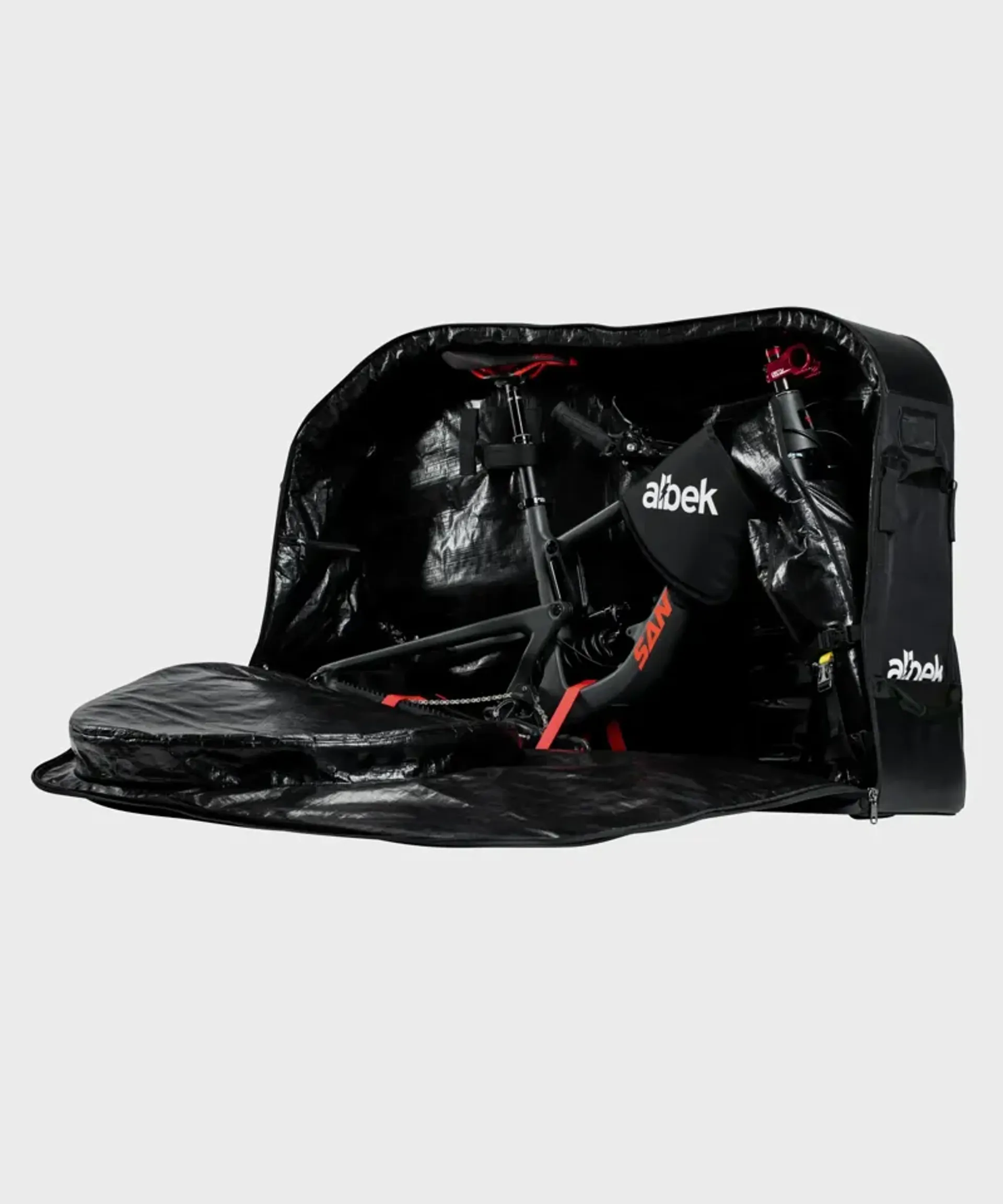 Featuring Albek's moulded lightweight reinforced honeycomb base, reinforced wheel assembly, padded wheel pouches, and an EVA frame stand that stabilises your frame.