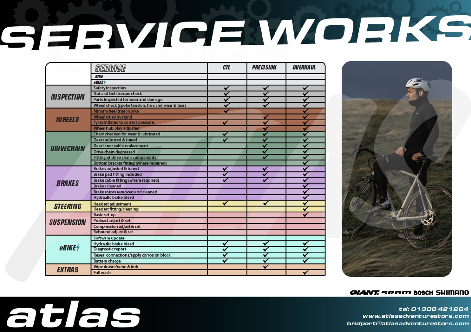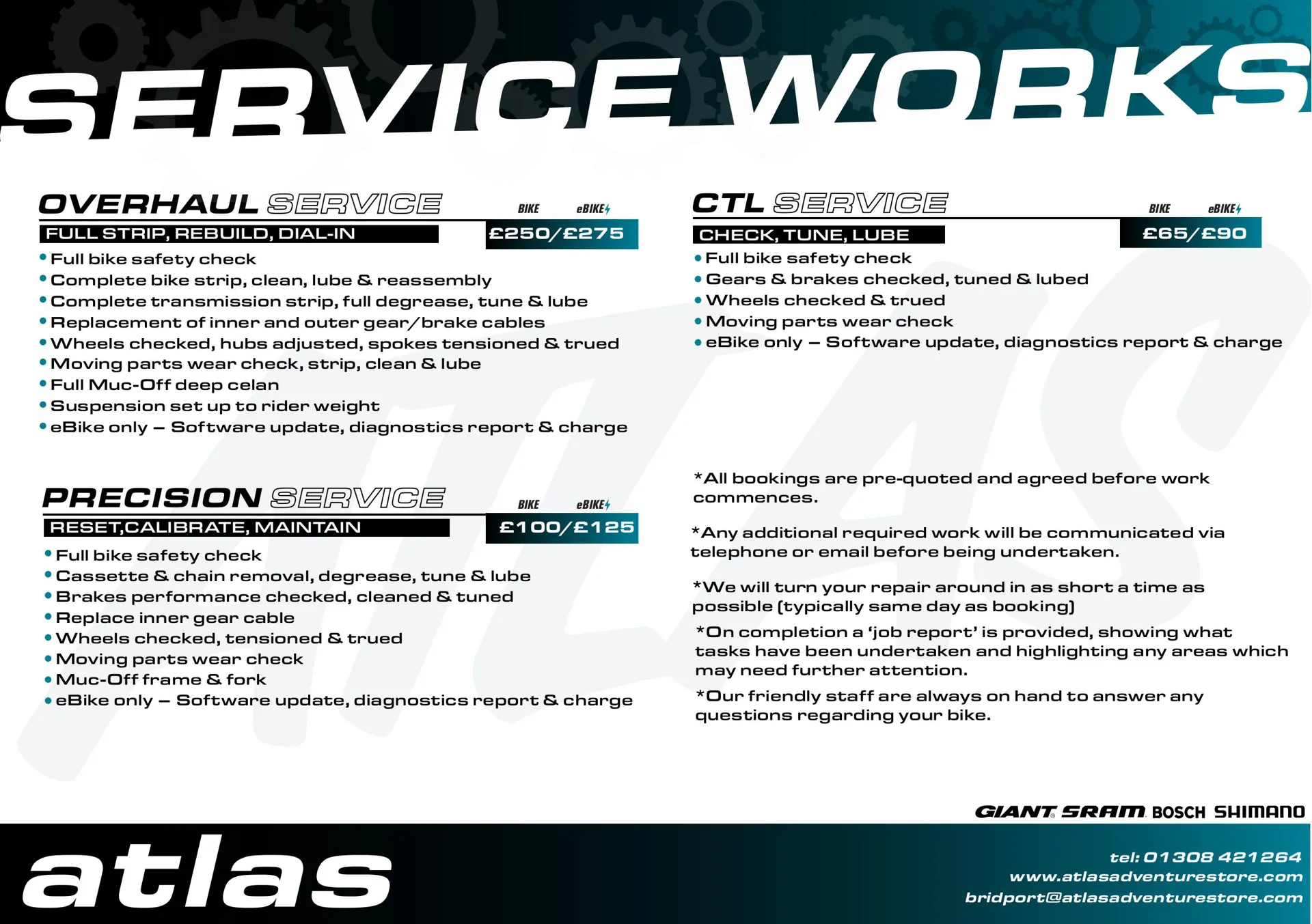 Ready to book your service? Call us on 01308 421264 or email hello@atlasadventurestore.com. Drop your bike off at our Bridport workshop and we’ll have it running like new in no time.